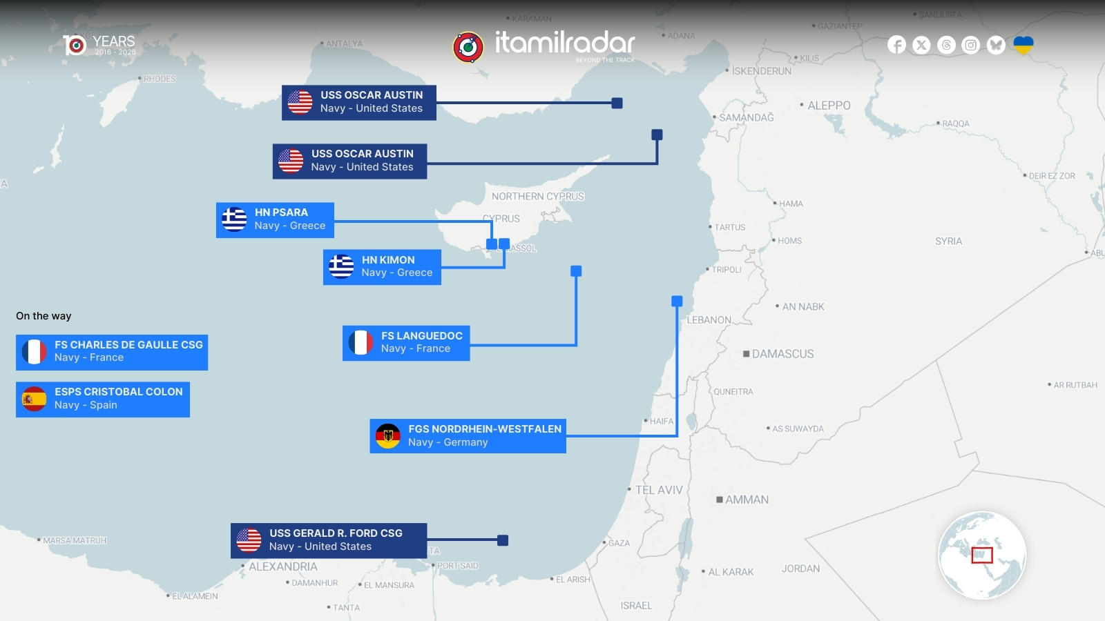 Σύμφωνα με το Itamilradar, μετά την κλιμάκωση των τελευταίων ημερών, αρκετά ευρωπαϊκά ναυτικά μέσα έχουν επισήμως αναλάβει να συμβάλουν στην άμυνα της Κύπρου. Μεταξύ των πλοίων που επιχειρούν αυτή τη στιγμή κοντά στο νησί βρίσκονται η γαλλική φρεγάτα FS Languedoc και τα πλοία του Ελληνικού Πολεμικού Ναυτικού HN Psara και HN Kimon.