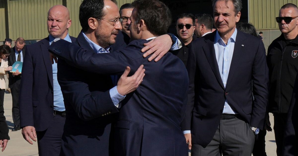 Ο Μακρόν και ο Νίκος Χριστοδουλίδης αγκάλιασαν ο ένας τον άλλον σήμερα το πρωί, στην αρχή της επίσκεψης του Γάλλου ηγέτη για να συζητήσουν θέματα “ασφάλειας” μετά την επίθεση ιρανικού drone στην βάση της RAF στο Ακρωτήρι» γράφει η εφημερίδα και προσθέτει: